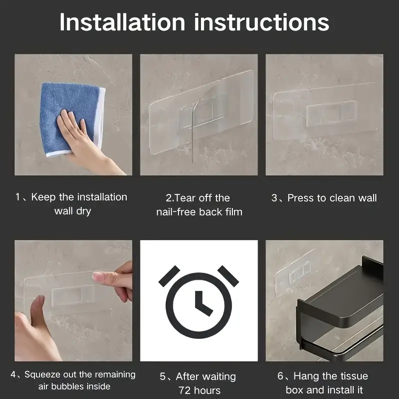 Suportul se fixează pe perete cu ajutorul unui adeziv puternic, ideal pentru suprafețe netede precum faianță, marmură, lemn lăcuit sau sticlă. Nu ai nevoie de bormașină sau dibluri, iar pereții rămân neafectați.