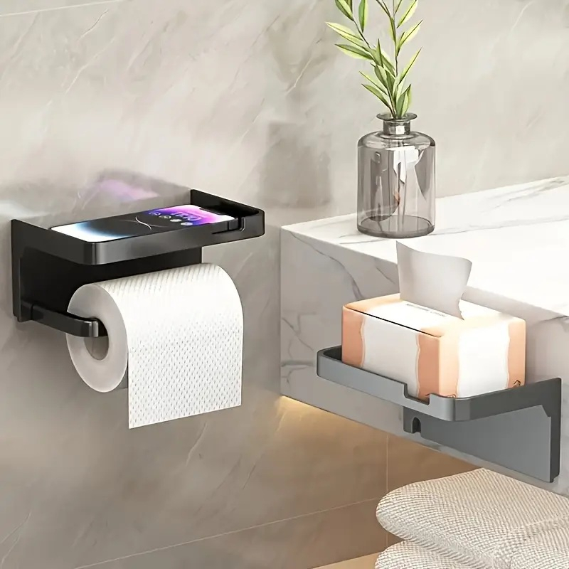 Organizează-ți baia eficient și modern cu acest suport autoadeziv pentru hârtie igienică, prevăzut cu un raft practic pentru telefon sau accesorii mici. Cu un design compact și elegant, în nuanța Gri Închis, suportul se potrivește perfect în orice baie, indiferent de stilul amenajării.