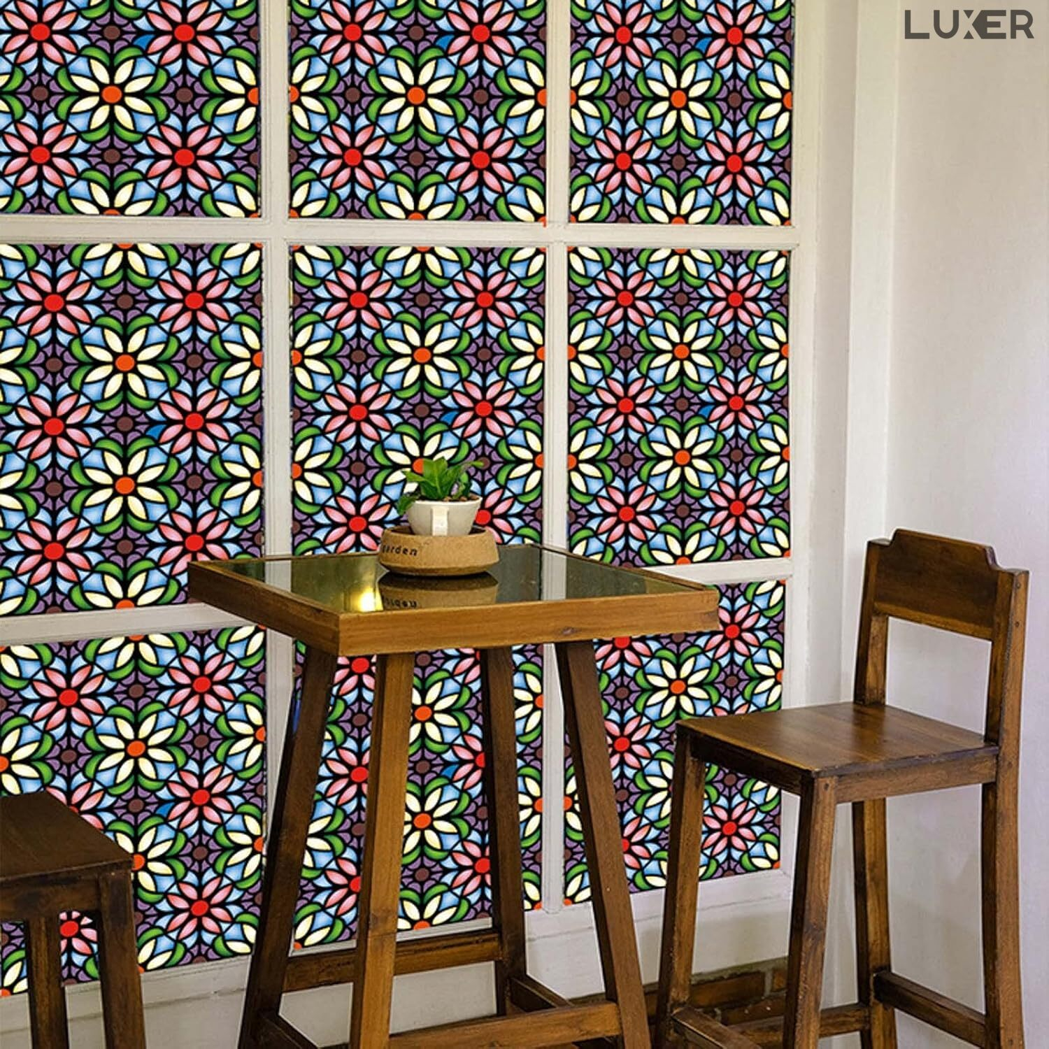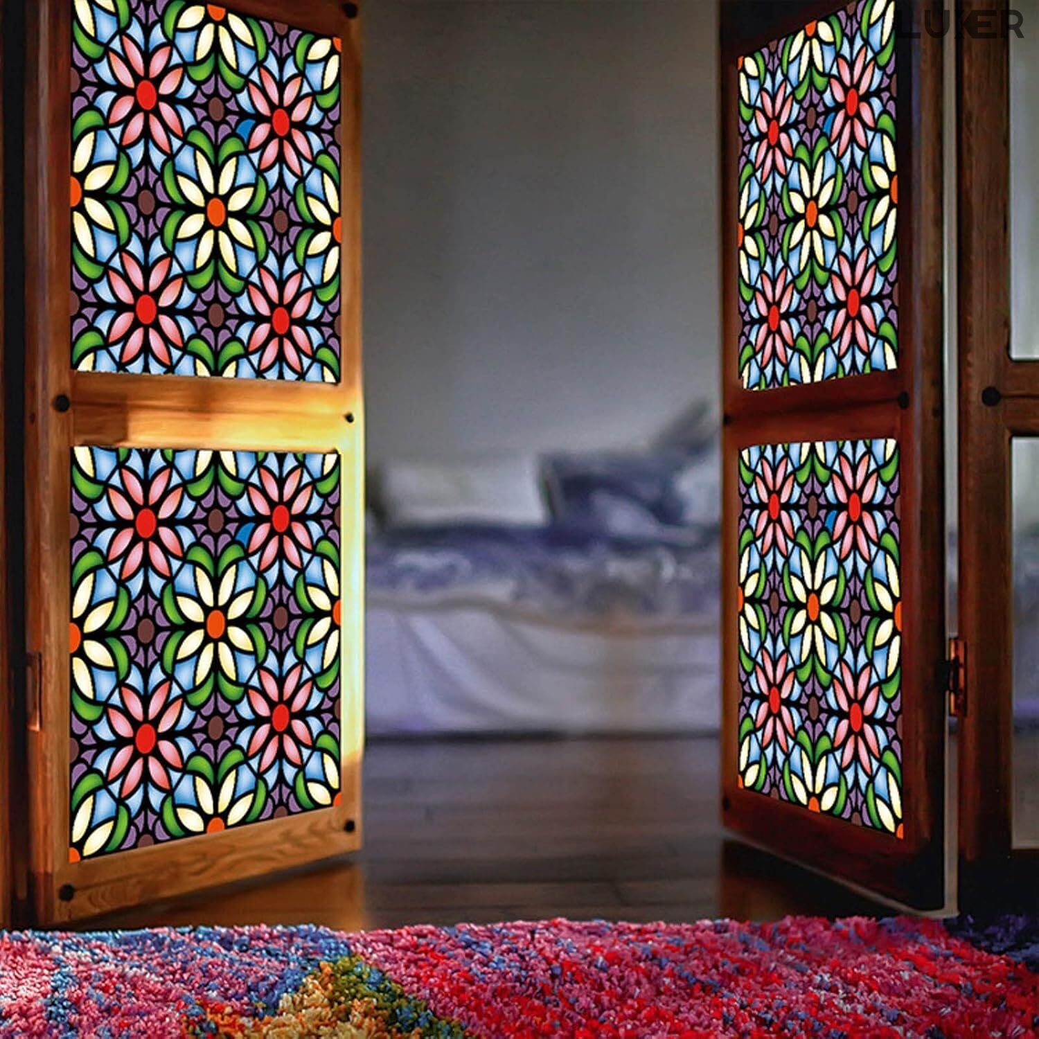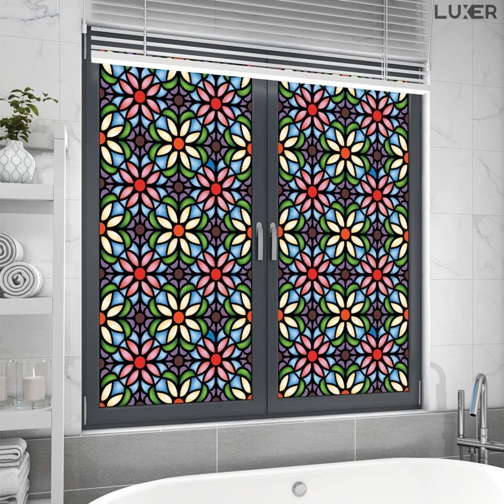 Adaugă eleganță și protecție ferestrelor tale cu folia autoadezivă Luxer cu efect de vitraliu si model Floral.