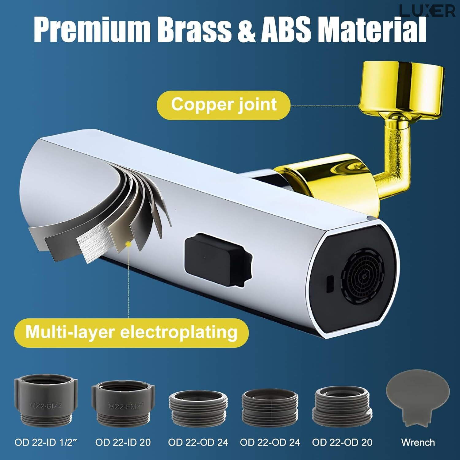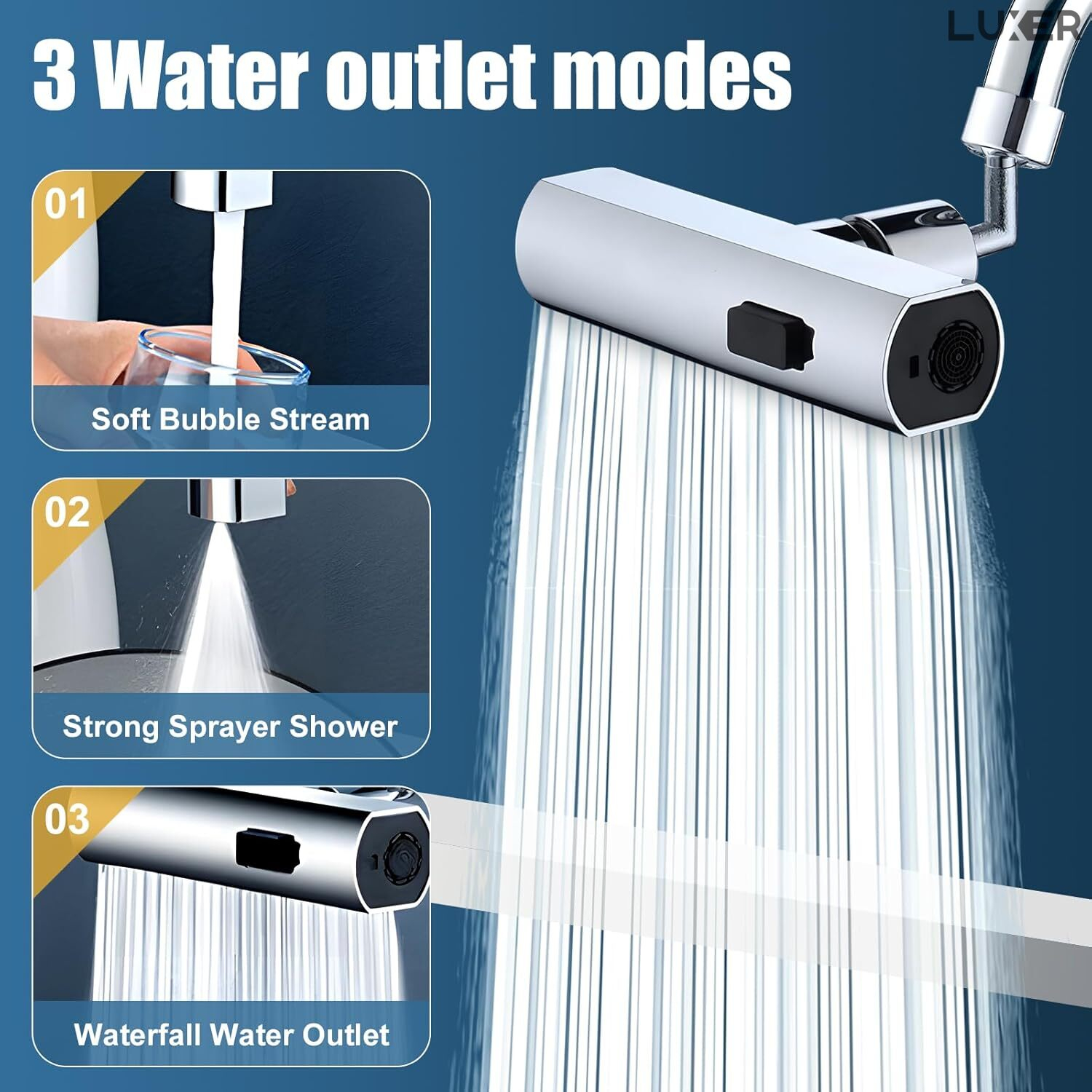 Optimizează-ți chiuveta cu Adaptorul Multifuncțional Luxer pentru robinet, cu brat pivotant și 3 moduri de funcționare: jet concentrat, pulverizare largă și mod mixt.