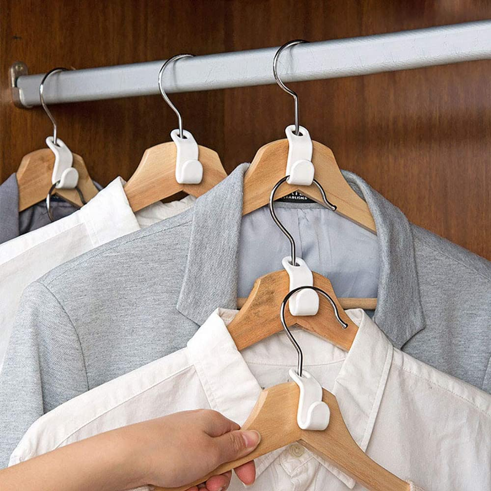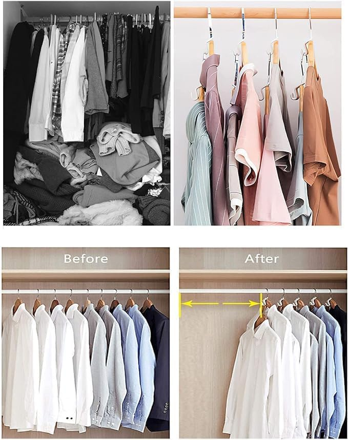 Sistem de Depozitare pe Verticală: Majoritatea dulapurilor au spațiu neutilizat sub hainele agățate. Prin conectarea umerașelor în cascadă, folosești acest volum, permițându-ți să depozitezi de până la 3 ori mai multe haine pe aceeași lungime de bară.