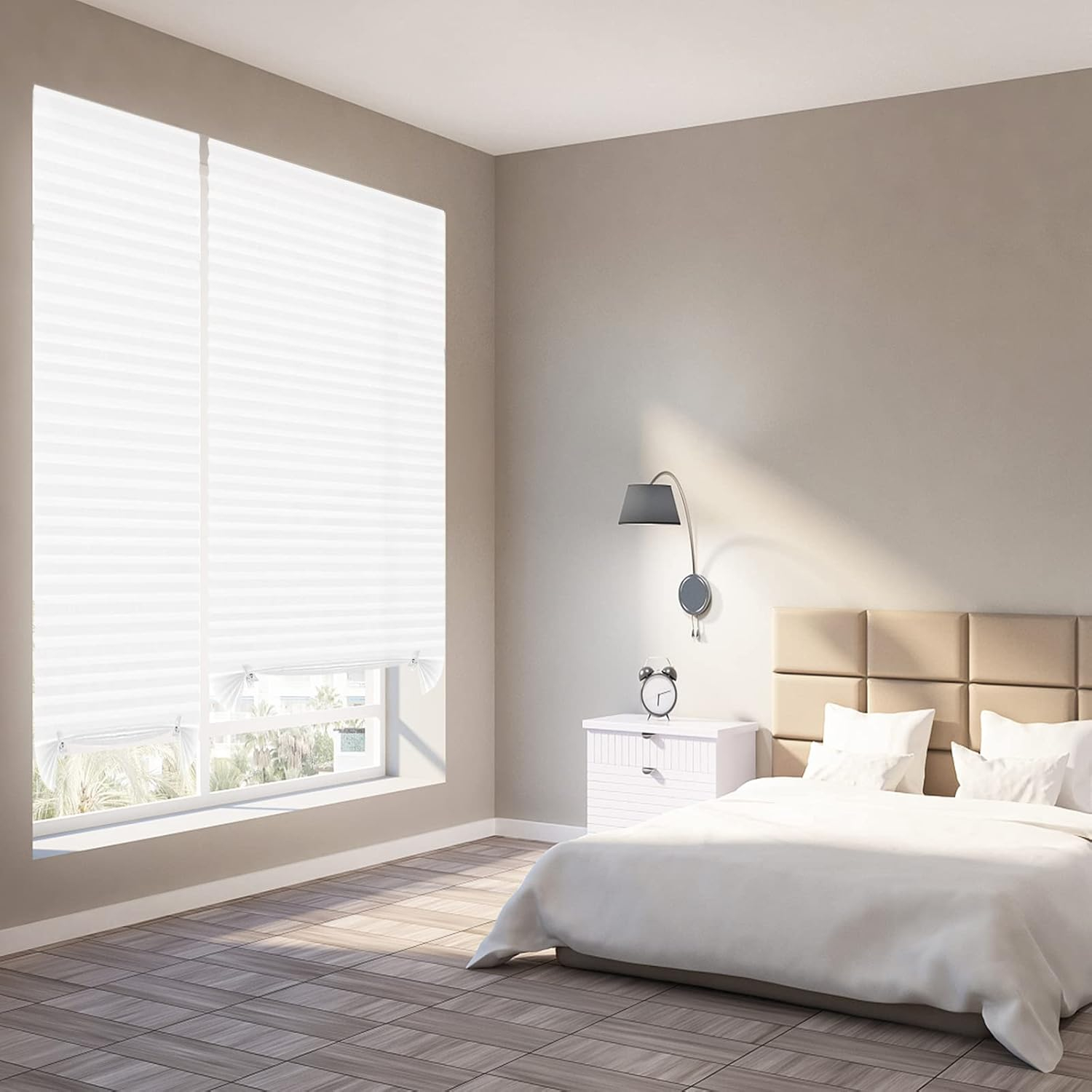 Fiecare jaluzea este dotata cu 2 clipsuri pentru a putea ajusta forma si cantitatea de lumina care intra in camera, permitandu-ti sa creezi o atmosfera placuta si confortabila. In plus, functia de protectie UV nu doar ajuta la mentinerea aspectului original al mobilei si a decoratiunilor, ci contribuie si la protejarea pielii tale si a sanatatii in general, deoarece expunerea prelungita la radiatiile UV poate avea efecte adverse asupra sanatatii pielii. Atunci cand este complet ridicata, jaluzeaua ocupa un spatiu minim, permitand o vizibilitate clara prin fereastra. Designul plisat al jaluzelei ii ofera un aspect elegant si estetic, potrivindu-se cu usurinta in diferite stiluri de interior. Pliseurile isi mentin forma bine definita, indiferent daca jaluzeaua este ridicata sau coborata.